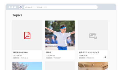 作成したお知らせページの一覧を確認したり、各お知らせの中身を閲覧できる、団体個別の専用サイトです。